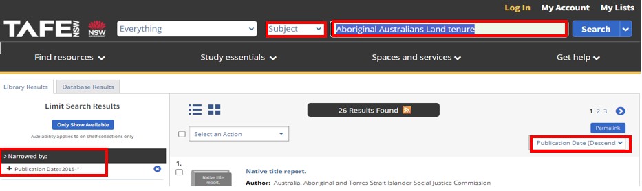 Add the genuine subject headings exactly as displayed on the TAFEcat e.g. Native title (Australia) without the full stop. Aboriginal Australians--Land tenure.